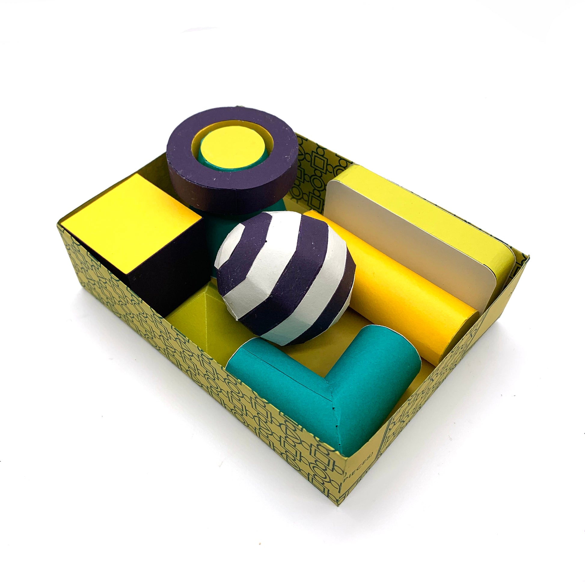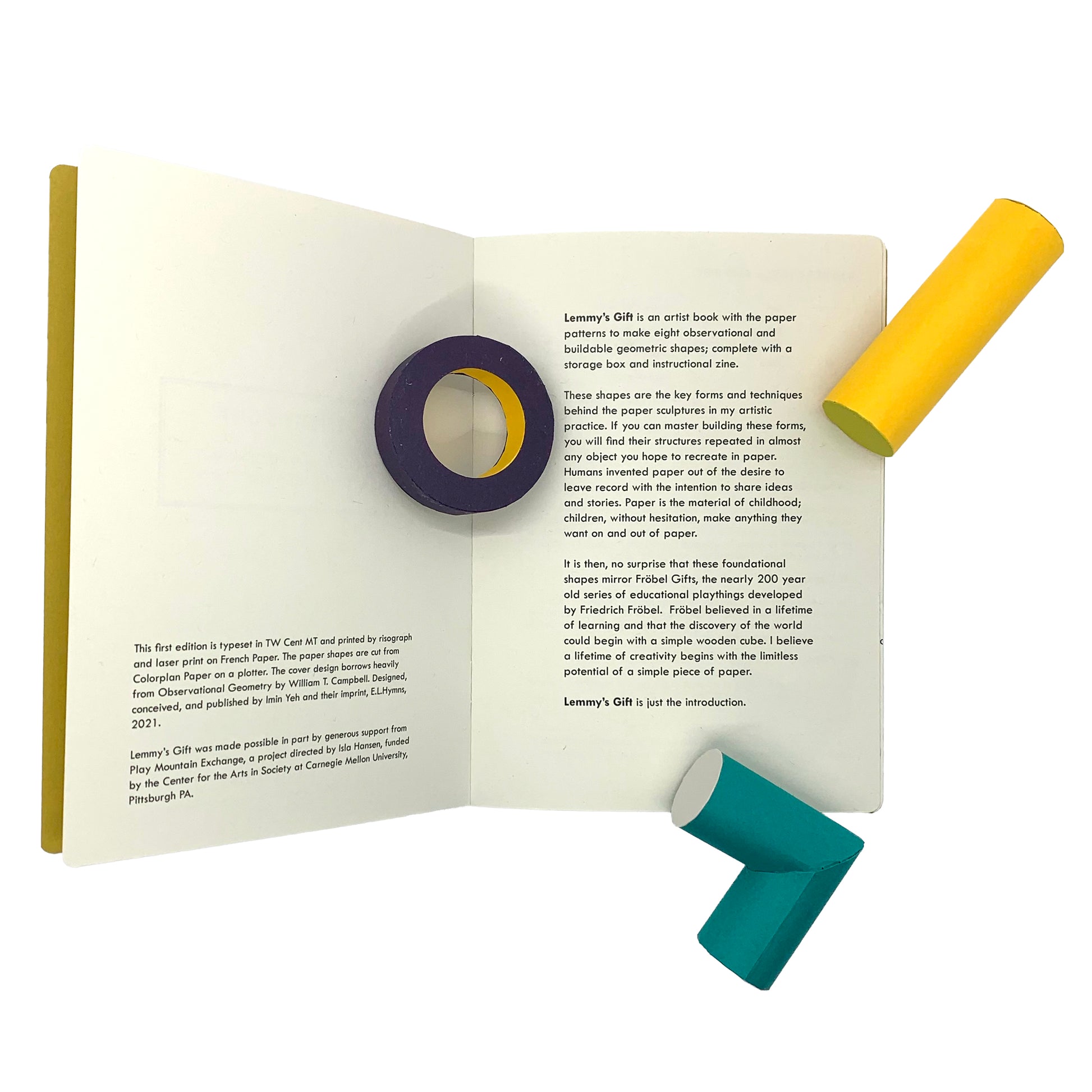 Lemmy’s Gift is an elaborate artist book playfully designed to teach the building blocks of paper sculpture. It contains an instructional zine alongside paper patterns to make eight observational and buildable geometric shapes (toys) as well as a storage box.